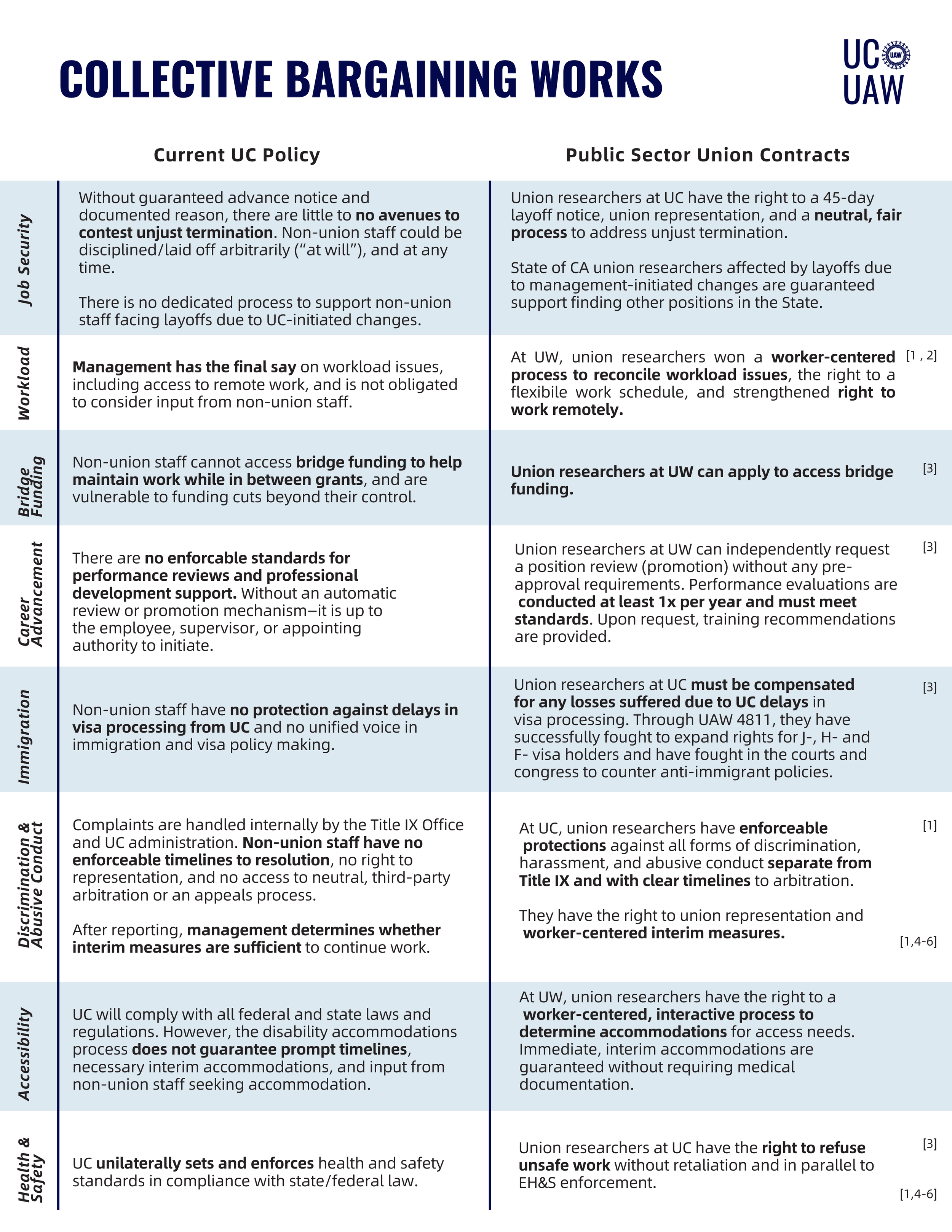 UC workers in non-union titles are vulnerable to arbitrary and disruptive changes to our working conditions, such as return to office mandates that fly in the face of employee input. But as soon as we form a union with UAW, the UC can no longer make unilateral changes like these without our consent — we gain the power to negotiate as equals over all aspects of our working conditions. And once we democratically vote on our collective bargaining agreement, the terms of our compensation, benefits, and working conditions are secured such that we can plan for the future with greater certainty and ease.